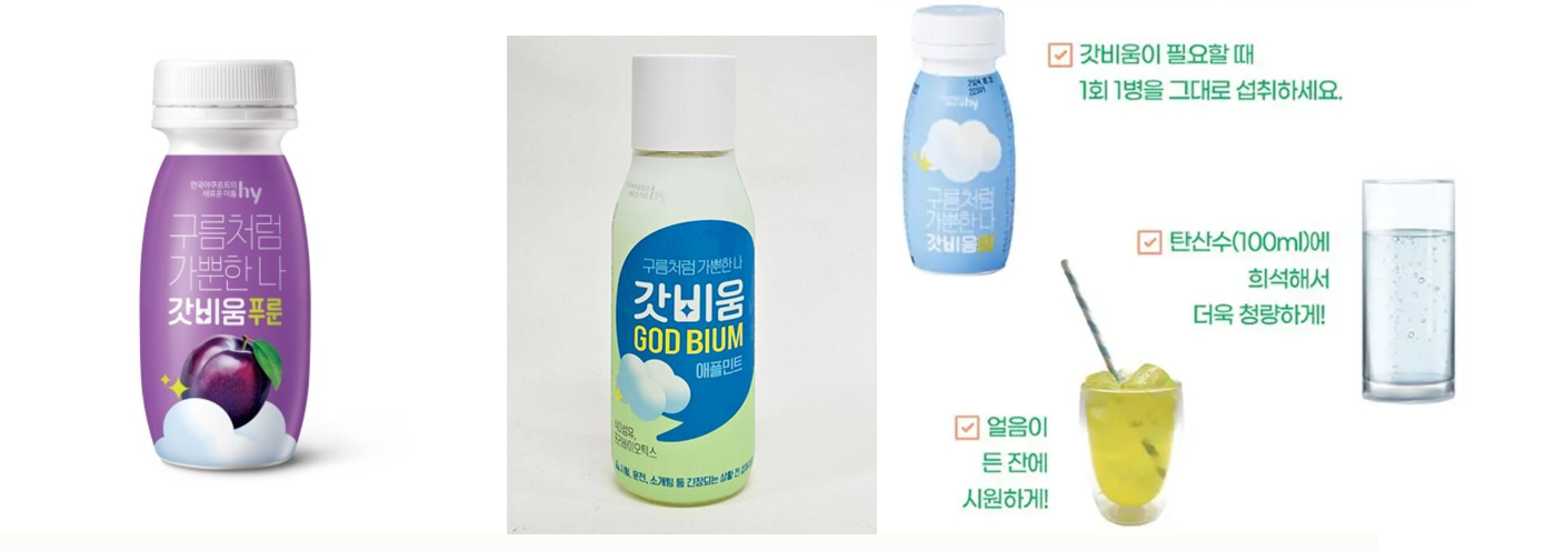 - 갓채움 : 수분보충에 효과적인 제품으로 운동 후나 여름철에 유용합니다. 특히 콜라겐과 글루타티온도 함유되어 피부개선에도 효과를 가져올 것으로 예상됩니다.
