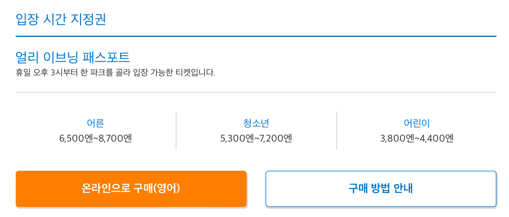 얼리 이브닝패스포트 : 휴일 오후 3시부터 한 파크를 골라 이용할 수 있는 티켓입니다.