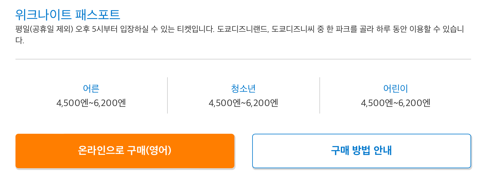 위크나이트 패스포트 : 공휴알을 제외한 평일 오후 5시부터 입장하여 이용할 수 있는 티켓입니다