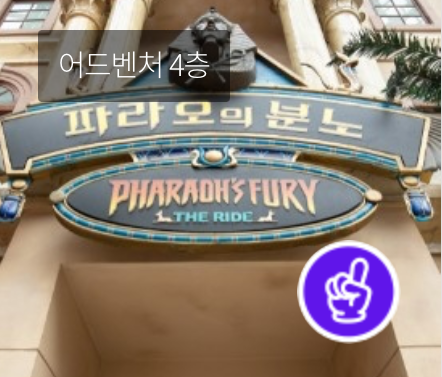 파라오의 보물을 찾아 떠나는 스릴만점의 다크라이드기구로 어두운 동굴 속을 탐험하는 기분을 만끽할 수 있습니다.파라오의 숨겨진 보물을 찾기 위해 빠른 속도로 정신없이 흔들리는 지프차를 타고 신전을 탐험한다는 설정을 가진 다크라이드이지만 전 세계 유일하게 외부트래이 있어서 파크에 입장하면 산에서 파라오의 분노 지프차가 다리를 건너거나 언덕을 오르는 모습을 볼 수 있습니다.