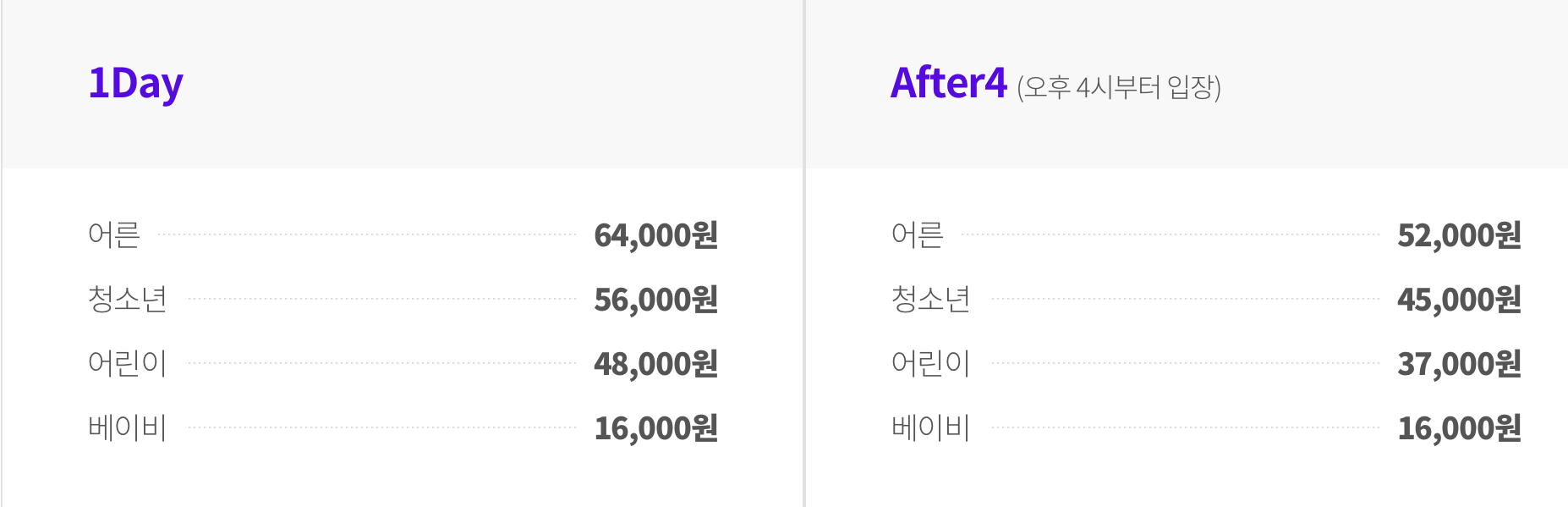 4시 입장권 - 성인 52,000원 / 청소년 45,000원 / 어린이 37,000원 / 베이비 16,000원
