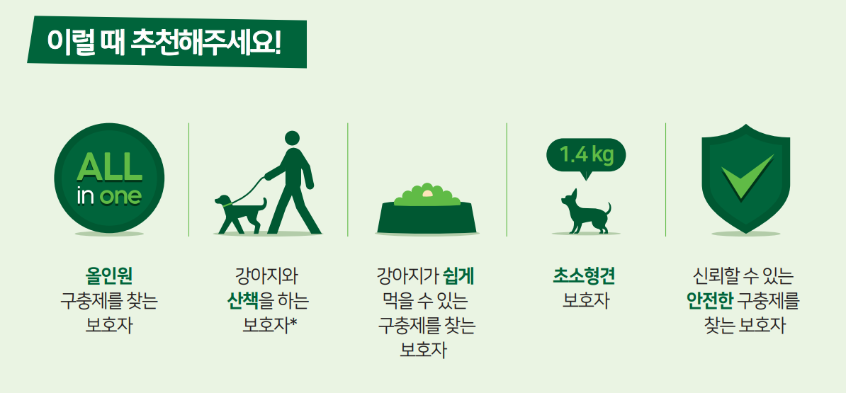 - 적용 대상: 8주령 이상, 체중 1.4kg 이상의 강아지부터 초대형견까지 체중별로 5가지 사이즈로 구분되어 맞춤 투약이 가능합니다.