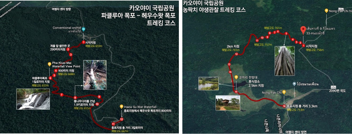 풍경: 이 코스는 경치 좋은 전망대에 도달하는 길로, 중간 중간 다양한 동식물 서식지를 지나가게 됩니다. 정상에 도착하면 카오야이의 광활한 경치를 한눈에 볼 수 있으며, 특히 일몰 시간대에 방문하면 더욱 아름다운 풍경을 감상할 수 있습니다.