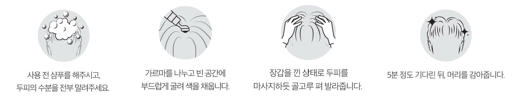 - 장갑을 낀 상태로 두피를 마사지하듯 골고루 펴 발라줍니다, 이때 액이 뭉치는 곳이 없도록 골고루 마사지해 주세요.