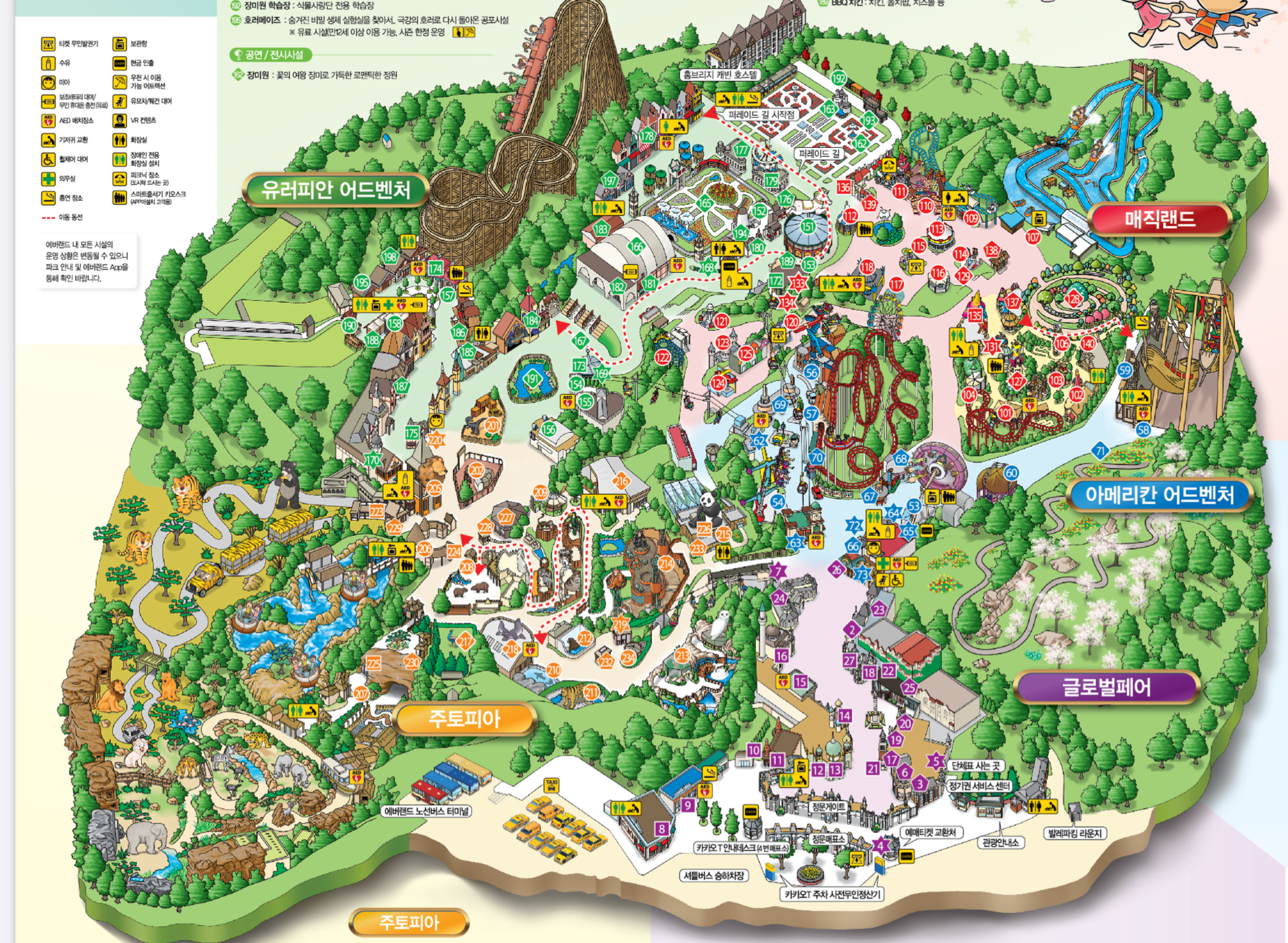 에버랜드는 주토피아, 글로벌페어, 아메리칸 어드벤처, 유로피안 어드벤처, 매직랜드 5가지 구역으로 나뉘어있습니다.