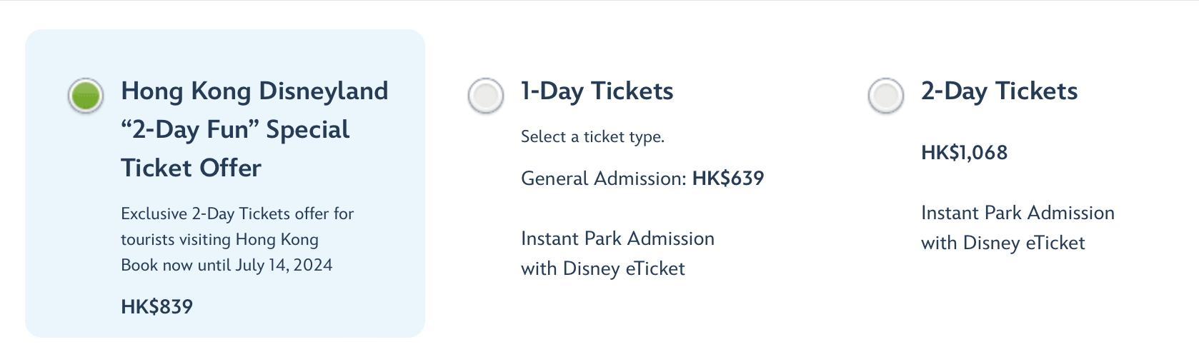 현재 2일 할인티켓을 7월 14일까지 HK$839에 살 수 있으며, 1일권은 HK$639, 2일권은 HK$1,068입니다.