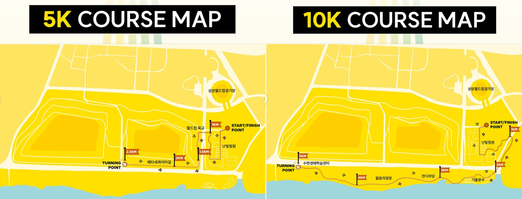 코스는 5km, 10km 2가지이며 참가자들은 미니언즈 테마의 코스튬을 입고 달릴 수 있으며 코스 곳곳에 다양한 포토존과 이벤트 부스가 마련되어 있어 참가자들이 달리면서 즐길 수 있습니다.