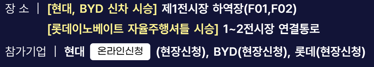 서울 모빌리티쇼에서는 신차, 자율주행차 시승을 체험할 수 있는데요, 현대는 온라인과 현장신청을, 다른 브랜드는 현장신청으로 체험이 가능합니다.